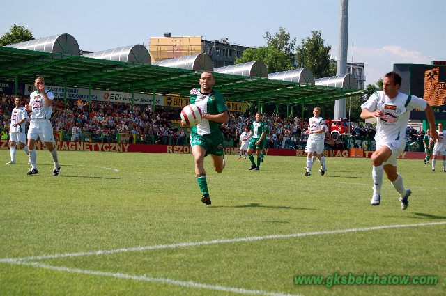 Groclin cofnął się do defensywy i potwierdził, że to jego bardzo mocna strona. Krótkie krycie rzadko pozwalało bełchatowianom dochodzić do klarownych sytuacji. Ciągle jednak próbowali i przeciwnicy czasem się gubili. To dlatego szanse miał Mariusz Ujek, ale próby strzałów przewrotką były nieudane, zaś uderzenia Nowaka i Wróbla – niecelne. Goście od czasu do czasu też groźnie kontrowali. Najlepszą okazję do podwyższenia wyniku zmarnował Sikora, który był już sam na sam z Sapelą.
