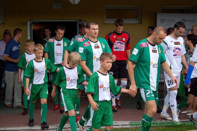 Ale to goście rozpoczęli mecz z większym animuszem. Grali bardziej ofensywnie i częściej byli na połowie bełchatowian, lecz Adrian Sikora i Filip Ivanovski przegrywali pojedynki ze środkowymi obrońcami. Wicemistrzom Polski dużo trudniej przychodziło długie rozgrywanie piłki niż w meczach przeciwko Wiśle. Agresywnie grający grodziszczanie skutecznie wybijali rywali z rytmu. Dopiero indywidualna akcja Rafała Boguskiego w 10 min przyniosła pierwszą szansę na gola. Pomocnik z Bełchatowa zdecydował się na rajd ze środka boiska, ale kiedy dobiegł z piłką do pola karnego, fatalnie strzelił.