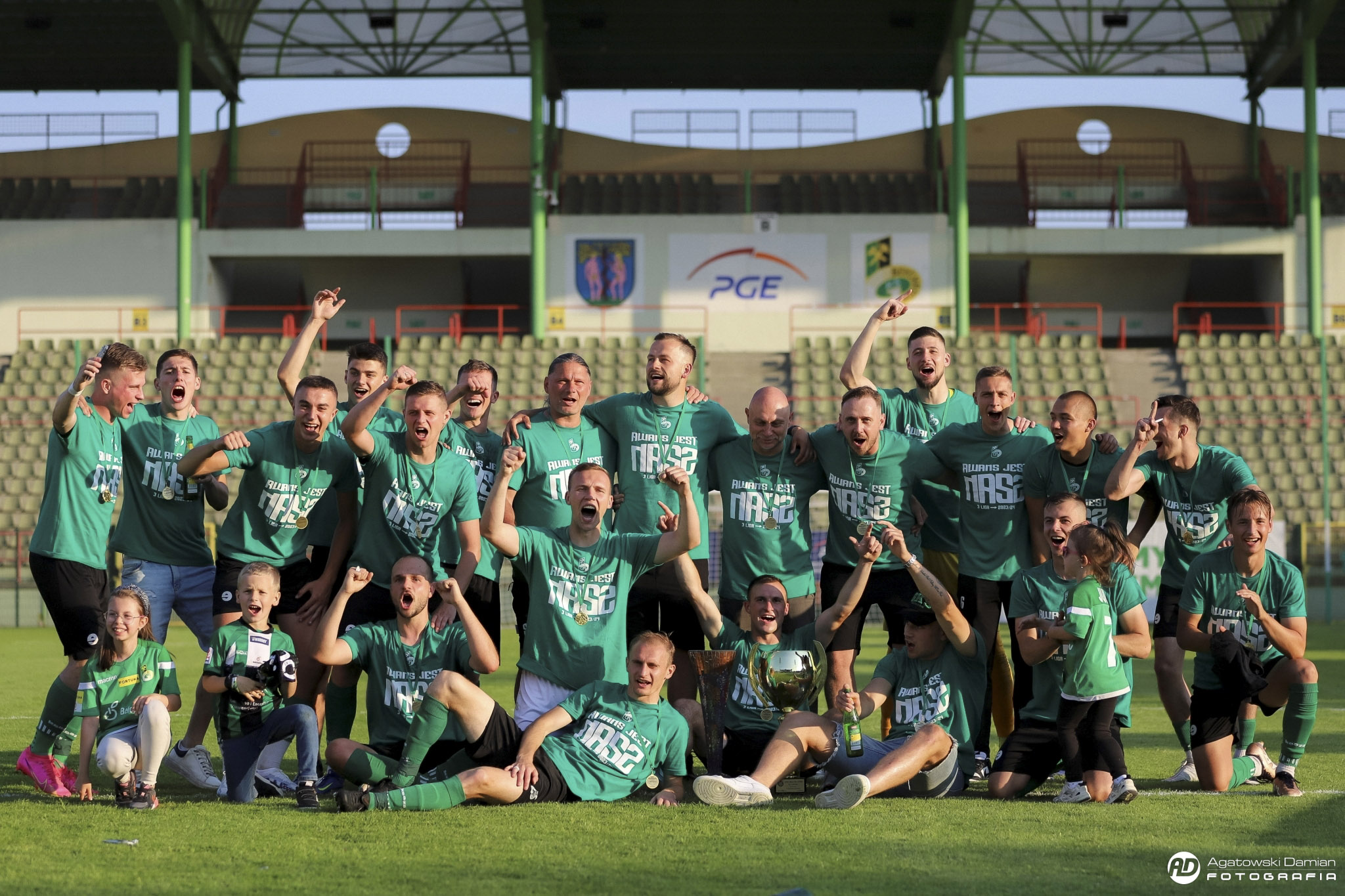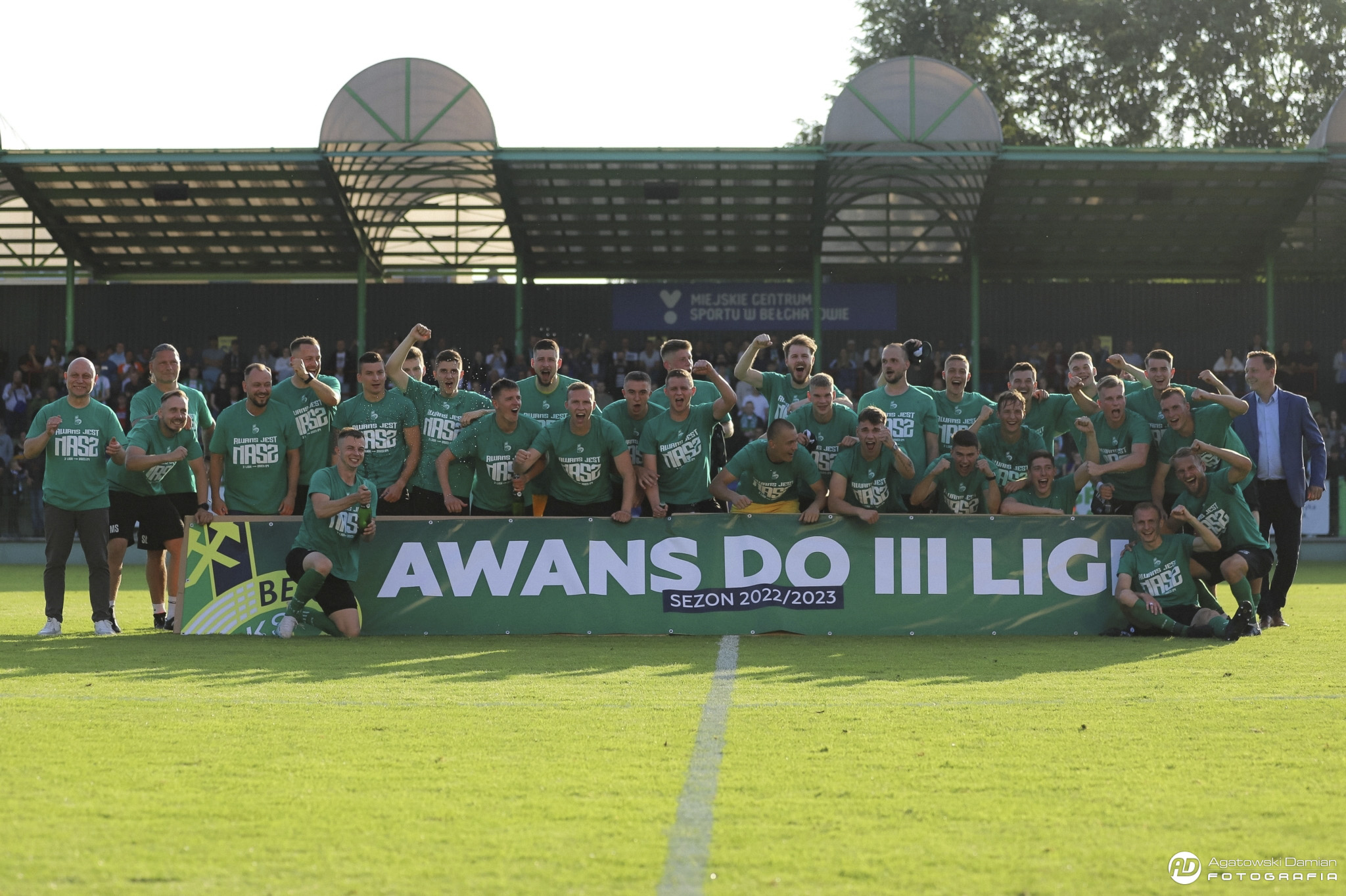 Ostatni gwizdek to szał radości na trybunach, strzelające korki od szampanów, przemówienia i gratulacje płynące z ust m.in. wiceprezydenta miasta Bełchatowa Dariusza Matyśkiewicza, wiceprezesa zarządu PGE GiEK, Waldemara Lutkowskiego oraz prezesa ŁZPN Adama Kazimierczaka. Pamiątkowe medale oraz puchary wręczane były na środku boiska, a po chwili cała drużyna ruszyła w stronę trybun, by wraz z kibicami świętować nasz wspólny sukces. Przyśpiewka „Awans jest nasz!” – jeszcze długo niosła się po stadionie.